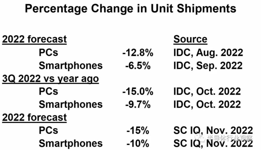 根據(jù)最新的出貨數(shù)據(jù),我們 Semiconductor Intelligence 現(xiàn)在預測 2022 年個人電腦出貨量將下降 15%,智能手機出貨量將下降 10%。