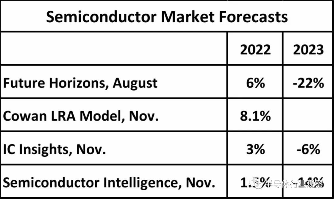 鑒于 2022 年第 3 季度半導體市場下滑 6.3% 以及 2022 年第 4 季度前景黯淡,只有在 2022 年第 3 季度 WSTS 數(shù)據(jù)發(fā)布后所做的預測才具有相關性。Cowan LRA 模型對 2022 年 11 月的預測為 8.1%,IC Insights 為 3%,我們 Semiconductor Intelligence 為 1.5%。
