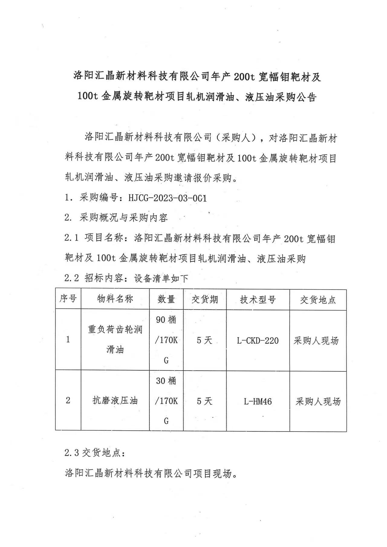 洛陽匯晶新材料科技有限公司年產(chǎn)200t寬幅鉬靶材及100t金屬旋轉(zhuǎn)靶材項目軋機(jī)潤滑油、液壓油采購公告